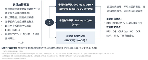 本研究是一项随机、开放标签、对照、多中心的II期临床研究,在全国33家中心纳入总计194例18-75周岁、组织病理学确认的复发或转移性宫颈鳞癌、腺癌和腺鳞癌、含铂化疗失败且既往经过系统治疗≤2线的患者,2:1:2随机分配到卡瑞利珠单抗(200 mg IV Q3W)联合法米替尼(20 mg PO QD)(A组)、卡瑞利珠单抗(200 mg IV Q3W)(B组)和研究者选择的化疗(C组)。研究设计如图: