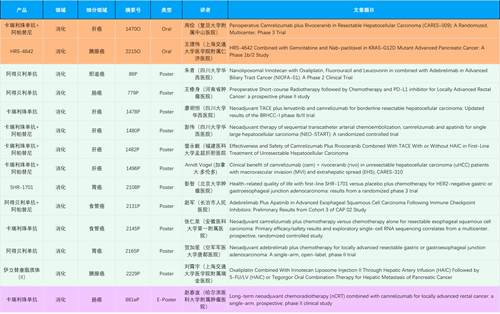 在消化系统肿瘤领域,AGGAME产品相关研究共入选2项口头报告、11项壁报和1项电子壁报,共14项研究。除卡瑞利珠单抗和阿帕替尼外,还有4篇阿得贝利单抗治疗消化系统肿瘤研究入选。HRS-4642、瑞拉芙普-α注射液(SHR-1701)等在研创新产品也有相应研究亮相。另有1项伊立替康脂质体(II)用于胰腺癌治疗的研究入选壁报。